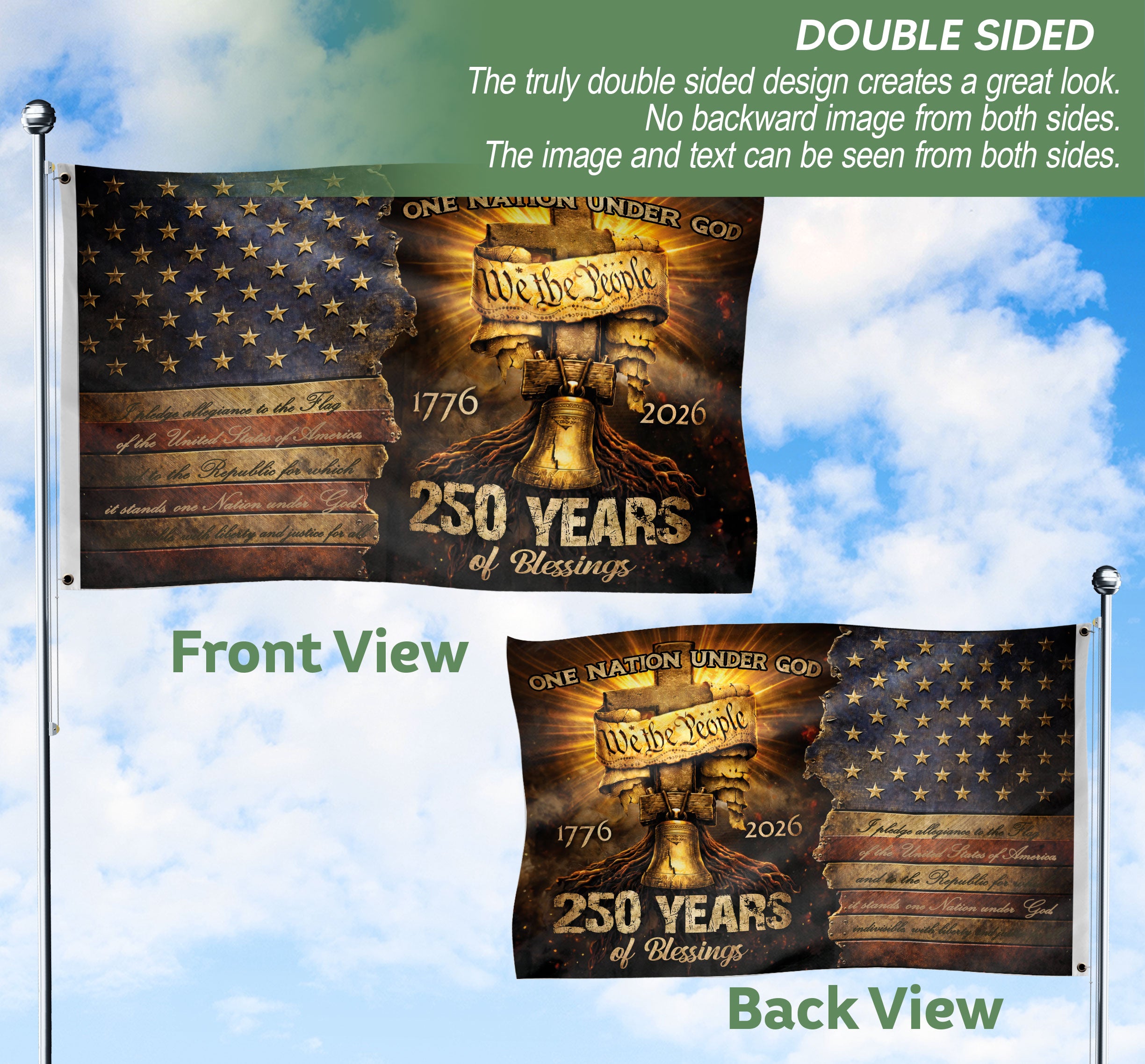 One Nation Under God 250 Years USA Flag 1776-2026 Eagle Cross Christian Double Sided House Flag
