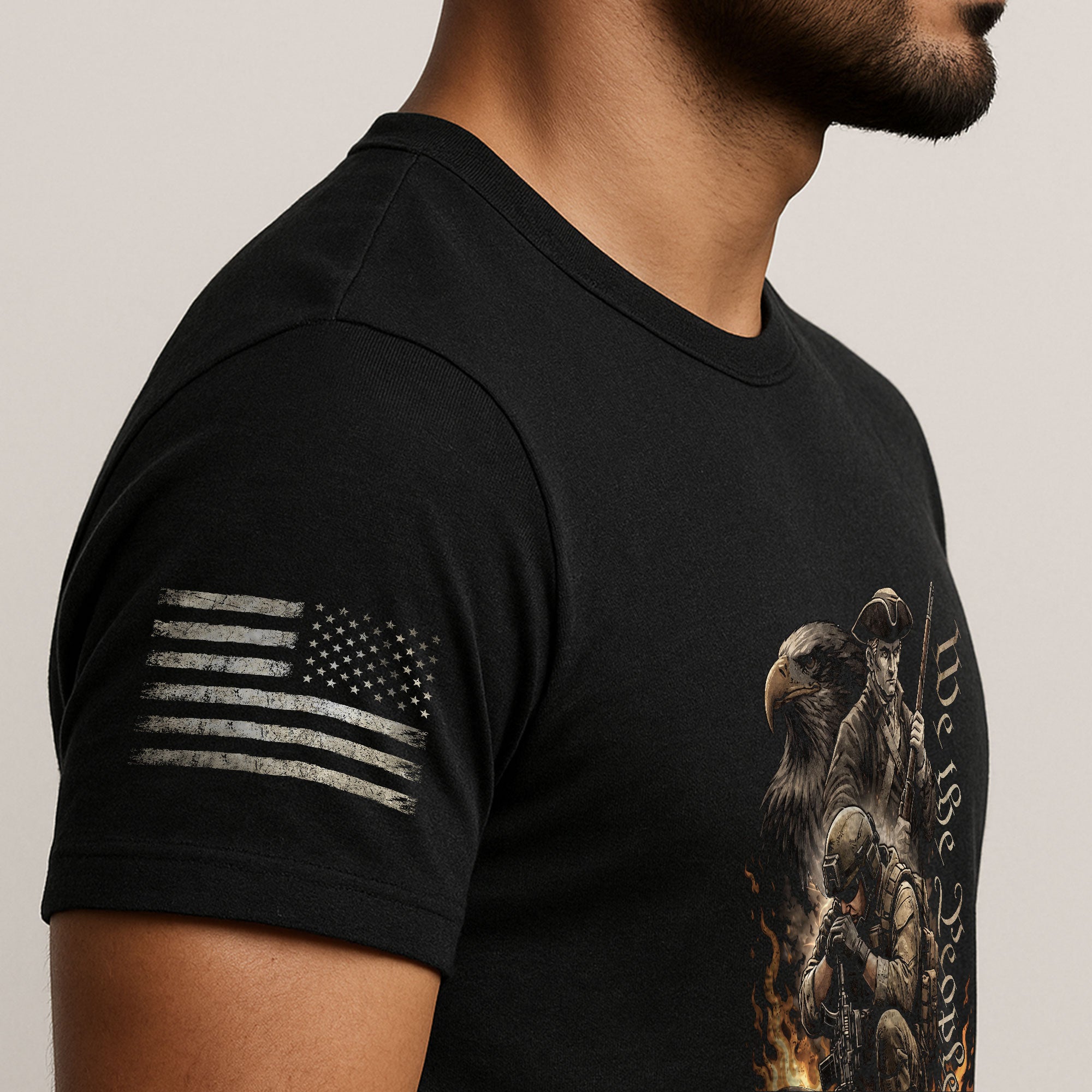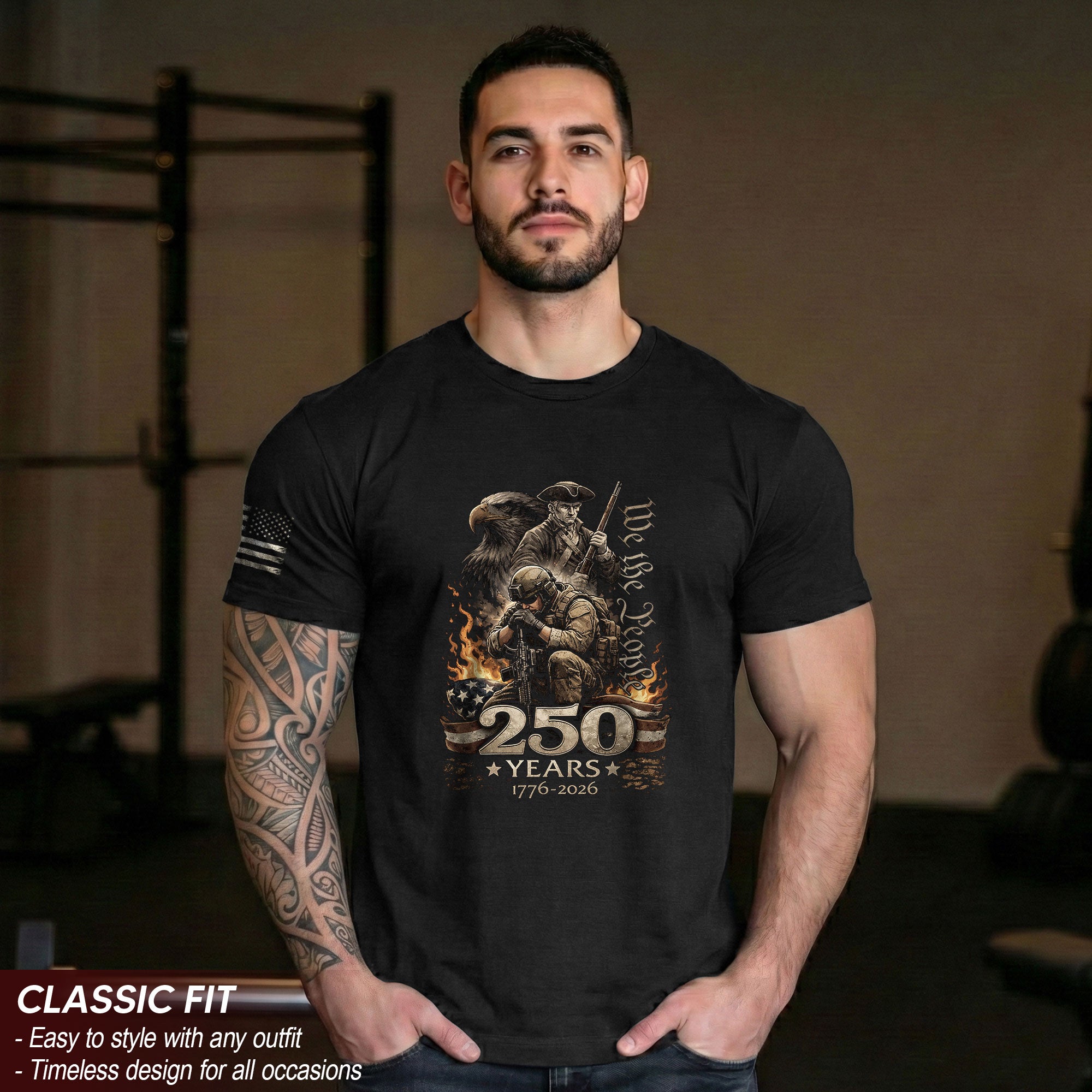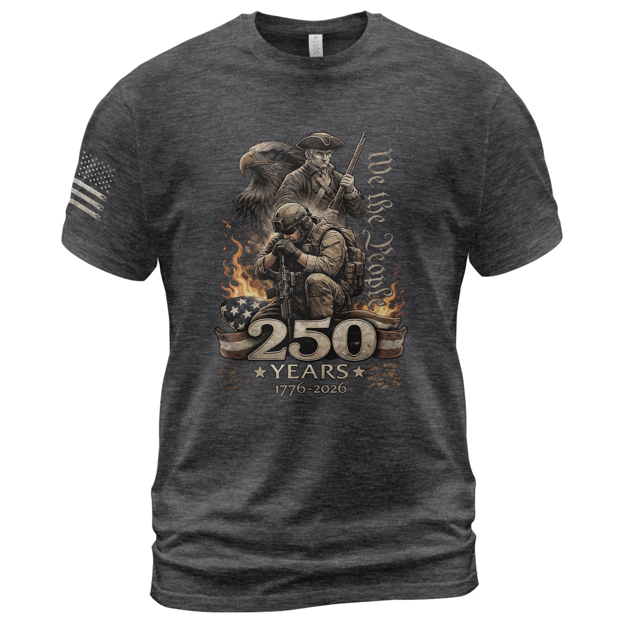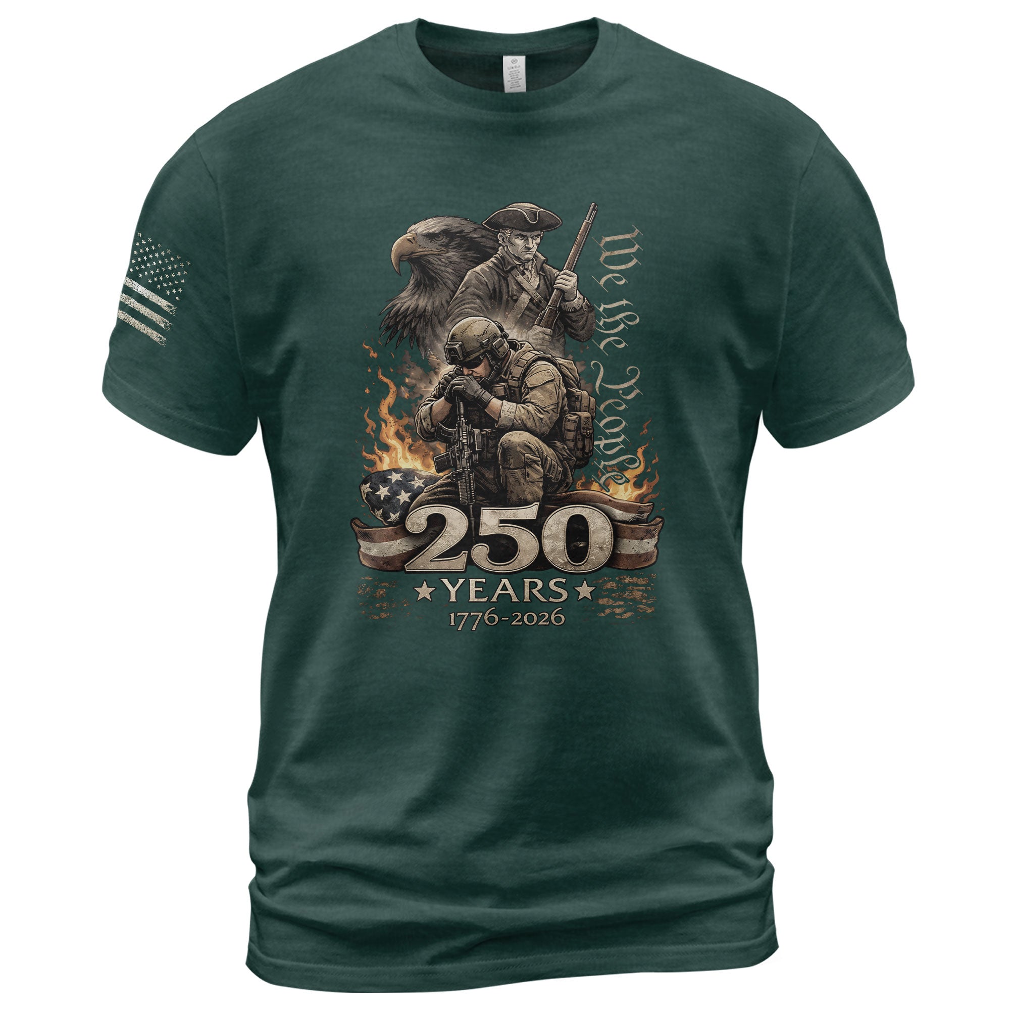 Inspired by the enduring words We The People, this design bridges the past and present to reflect 250 years of American history and shared values. Blending historical roots with a modern perspective, it honors the strength, resilience, and unity that continue to shape the nation across generations.