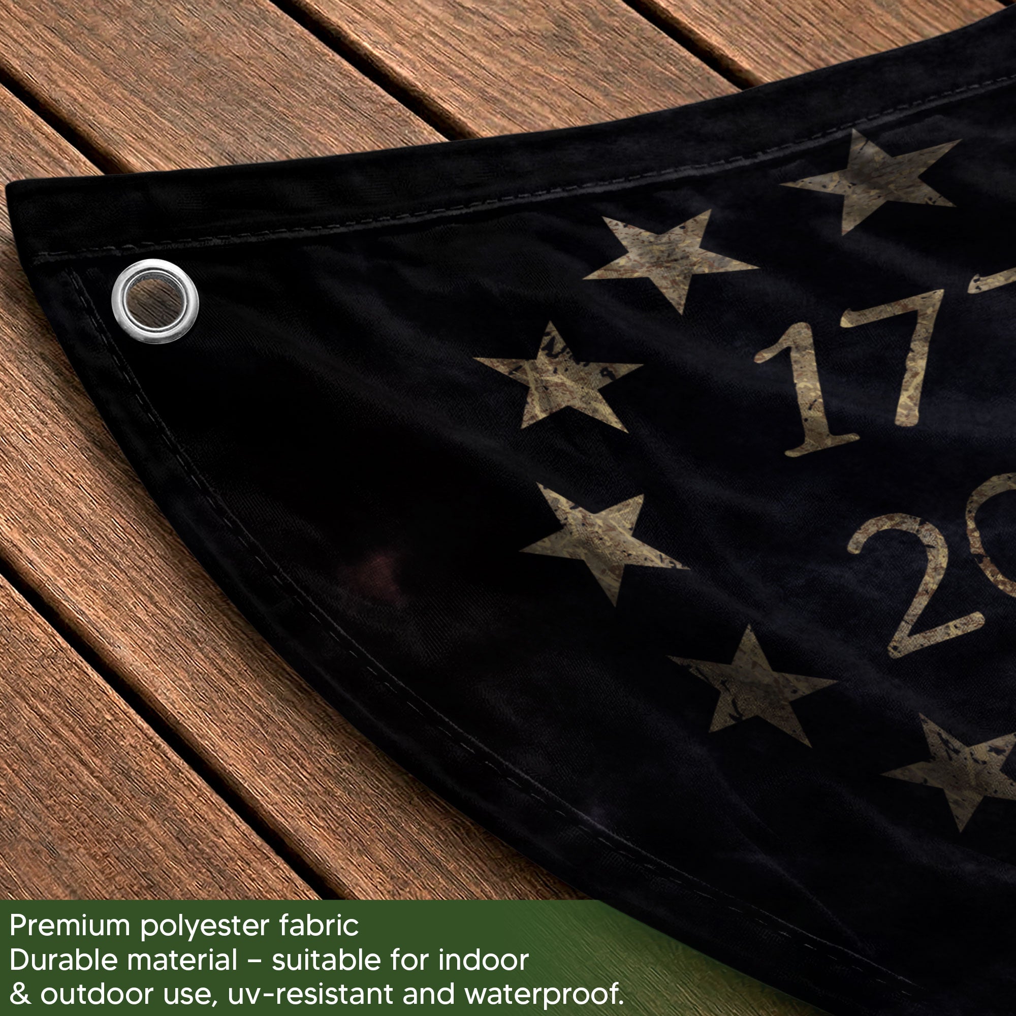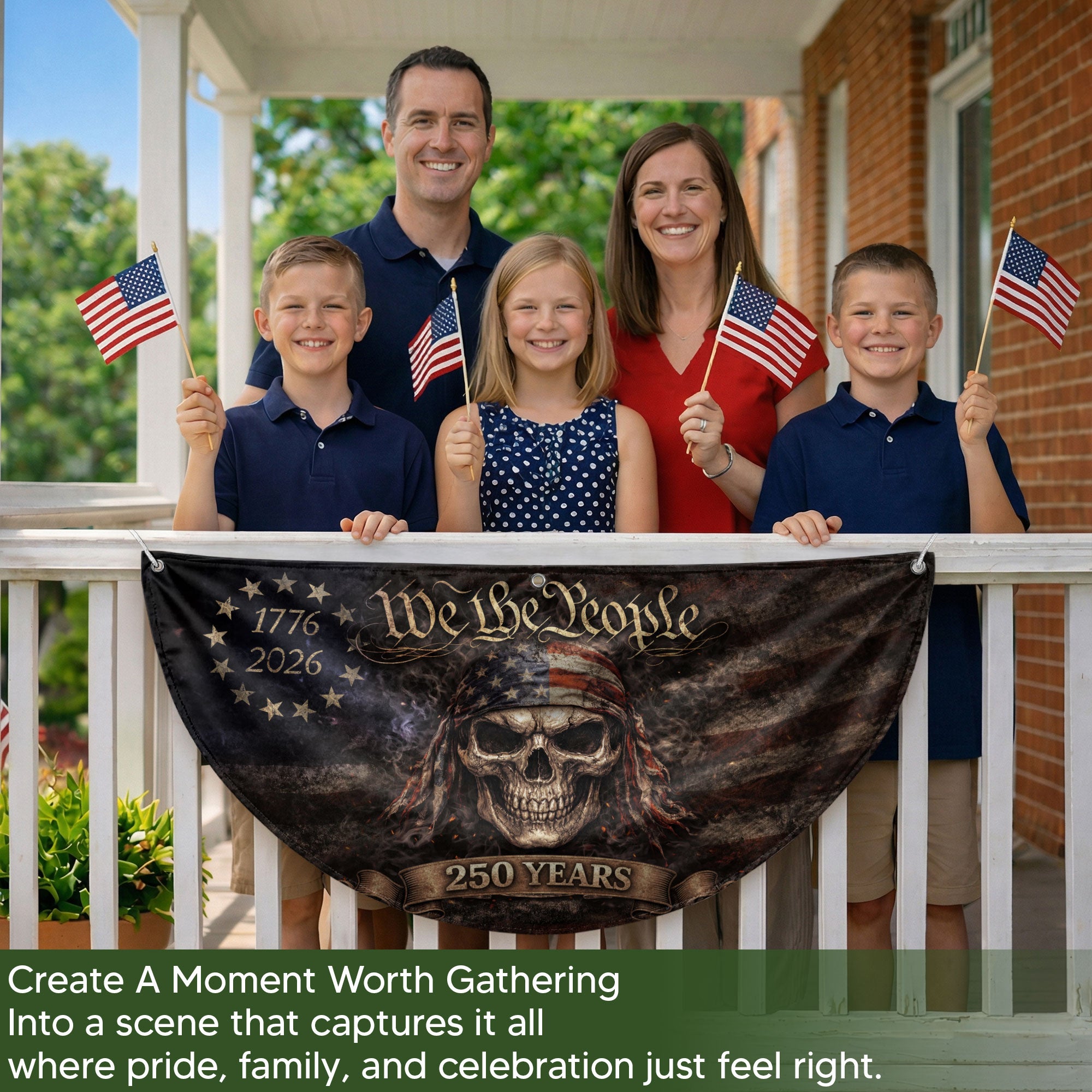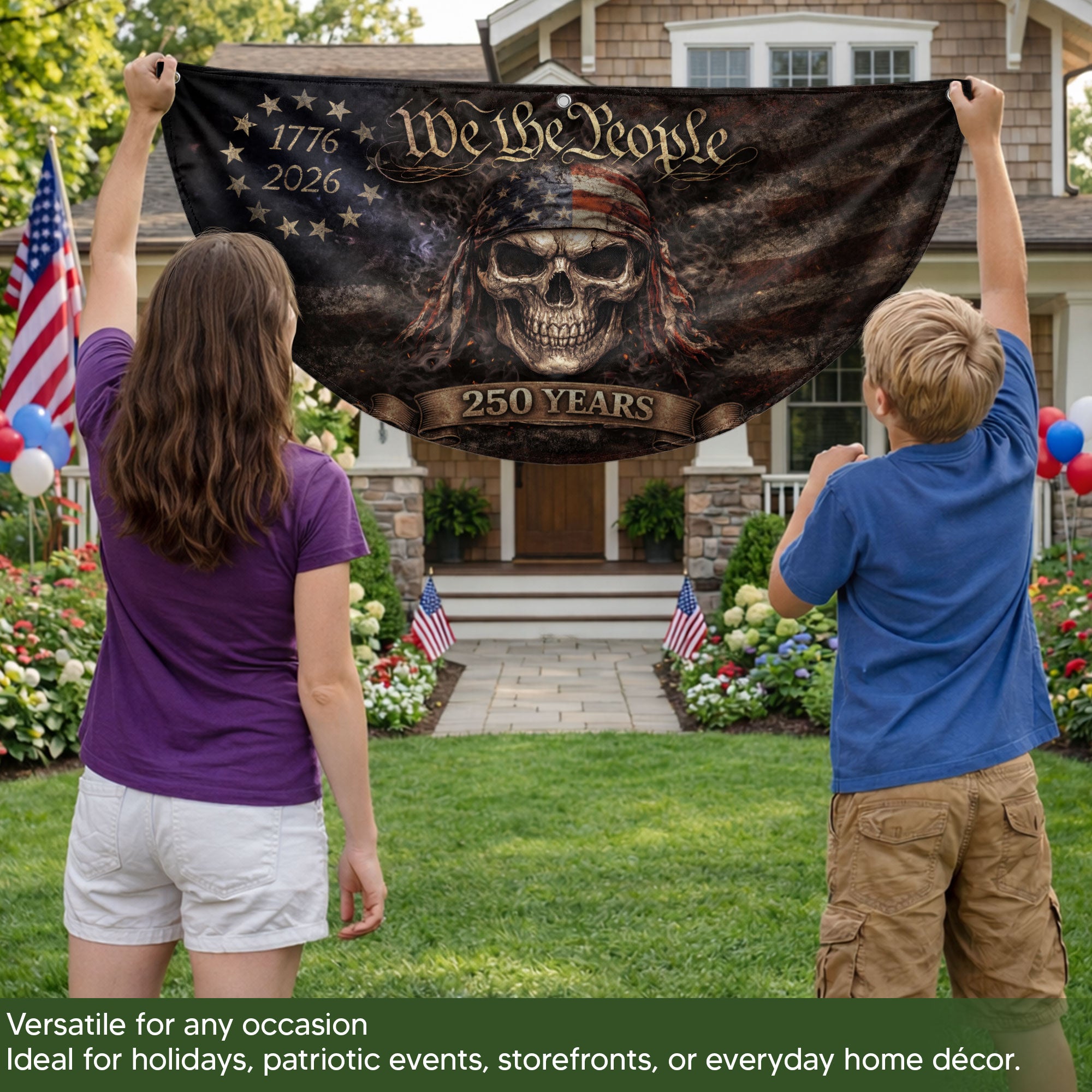 Celebrate America’s 250th anniversary from 1776 to 2026 with the We The People Skull Fence Flag. This double-sided patriotic banner features a bold skull design in rugged vintage American style, perfect for displaying your pride on fences, patios, porches, or any outdoor space. Crafted from high-quality, durable, weather-resistant fabric, it withstands wind, rain, and sun exposure for long-lasting vibrancy. Easy to hang with reinforced edges and grommets, this garden flag measures standard size for versatile use in yards, decks, or events. Ideal for patriots honoring the nation’s history and future.